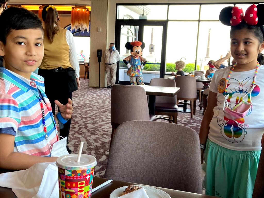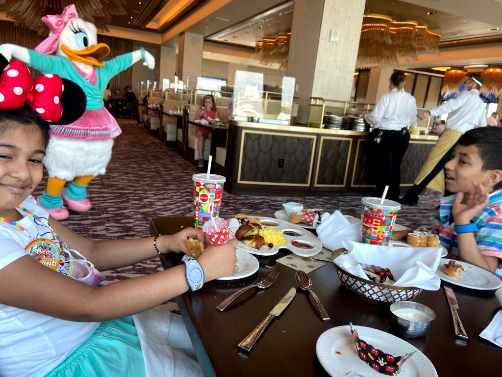 The difference with character greeting during pandemic was the social distancing element. All the characters appeared in background of our pics during their performances atleast 10 feet away form whee we were deating. The charcter appeared 2-3 times to perform and stop by for some photo ops. The were dressed like a artists with thir apron and painters pallete. Our favorite was mINI mouse. Her costume and amazing grace in her greetings was talk of the restaurant! Also the autographs were presigned ina a beautiful envelope to take home as memorabilia. The breakfast was so wholesome. There were plenty of mini muffins were provided on the table even befor ewe ordered and we got to take some with us. No one can completely finish the portion size provided per order. Definitely another must-do checked on our list of dining.